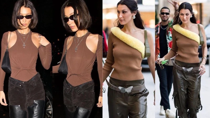 超模 Bella Hadid 也多次演譯了「美拉德」經典的棕黑配,首先是略帶工裝色彩的紐結上衣,鎖骨兩側挖洞,黑色牛仔褲翻口設計,配上疊戴項鍊,設計感滿滿。另一套則是斜領設計的長袖上衣,再加上黑色皮褲與蝴蝶垂墜腰帶,將甜、酷完美融合。