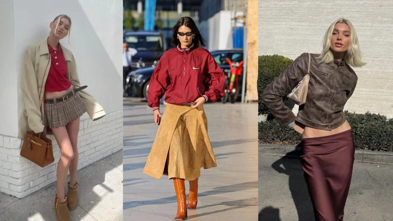 紅色可以說是「美拉德」穿搭中的點睛之筆了,Elsa Hosk 將學院風與美拉德風混和得相當融洽,卡其外套、格紋短裙,棕色靴包,整體就像是個英倫風叛逆少女。另一套則是以棕紅長裙,搭配做舊皮衣,展現出獨特的復古風味。超模 Bella Hadid 則是以淺棕色的麂皮長裙,搭配亮眼的橘棕色皮靴,最後換上紅色棒球外套,統一整體色調。