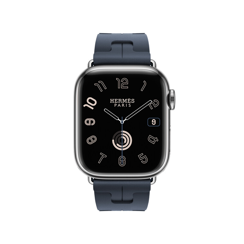 APPLE WATCH HERMES 9系列_45mm銀色不銹鋼錶殼_海軍藍色 Kilim 橡膠單圈折疊錶釦錶款_NT$ 42,400