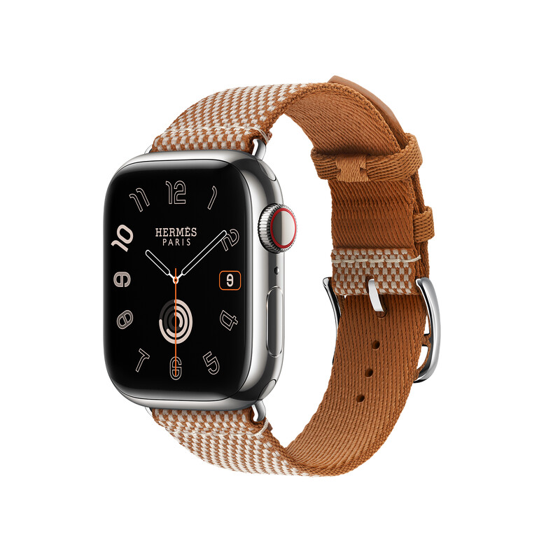 APPLE WATCH HERMES 9系列_45mm 銀色不銹鋼錶殼_卡其色 Kilim 橡膠單圈折疊錶釦錶款_NT$ 42,400