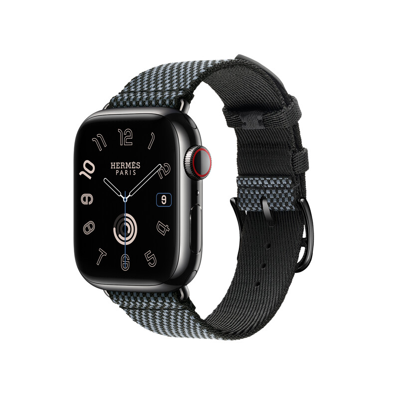 APPLE WATCH HERMES 9系列_45 mm銀色不銹鋼錶殼_黑色搭配金色_尼龍編織 Twill Jump 單圈錶款_NT$ 42,400