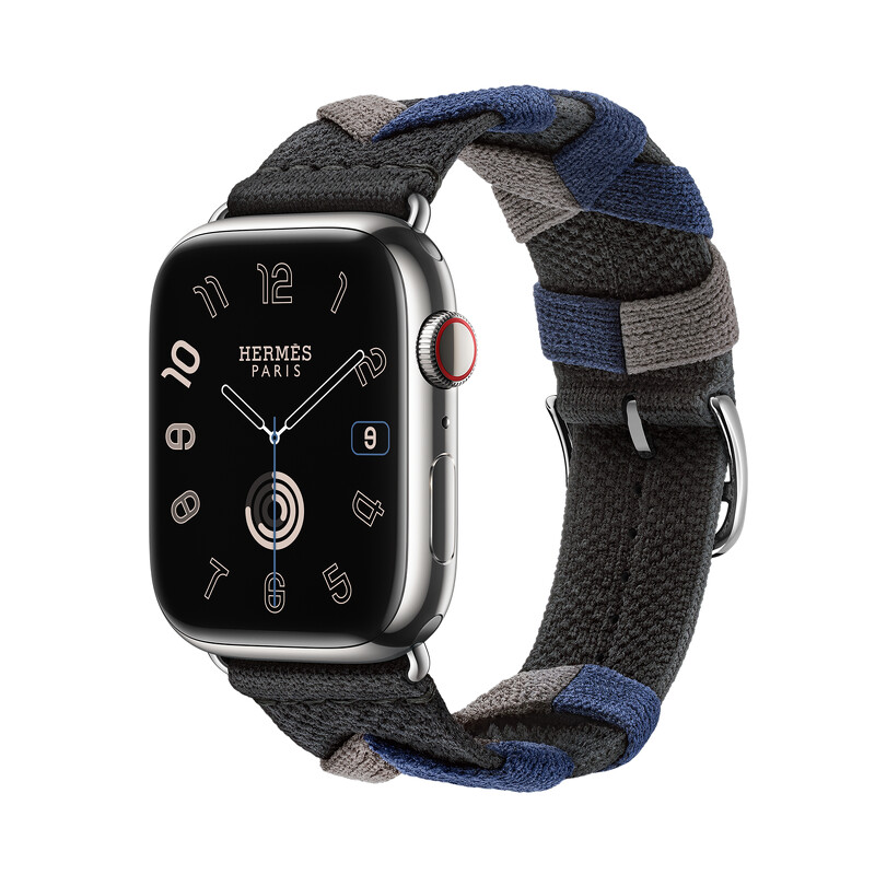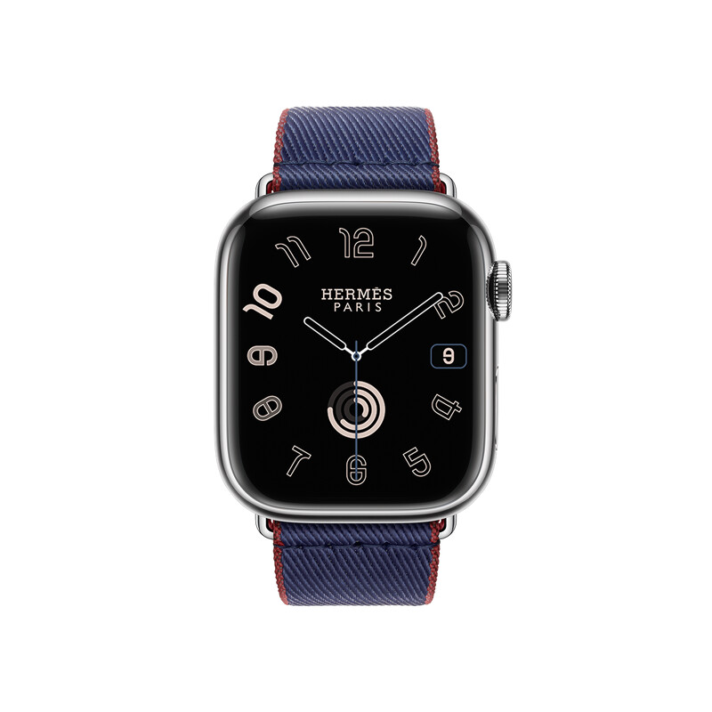 APPLE WATCH HERMES 9系列_45 mm銀色不銹鋼錶殼_海軍藍色搭配愛馬仕紅色_尼龍編織 Twill Jump 單圈錶款_NT$ 42,400