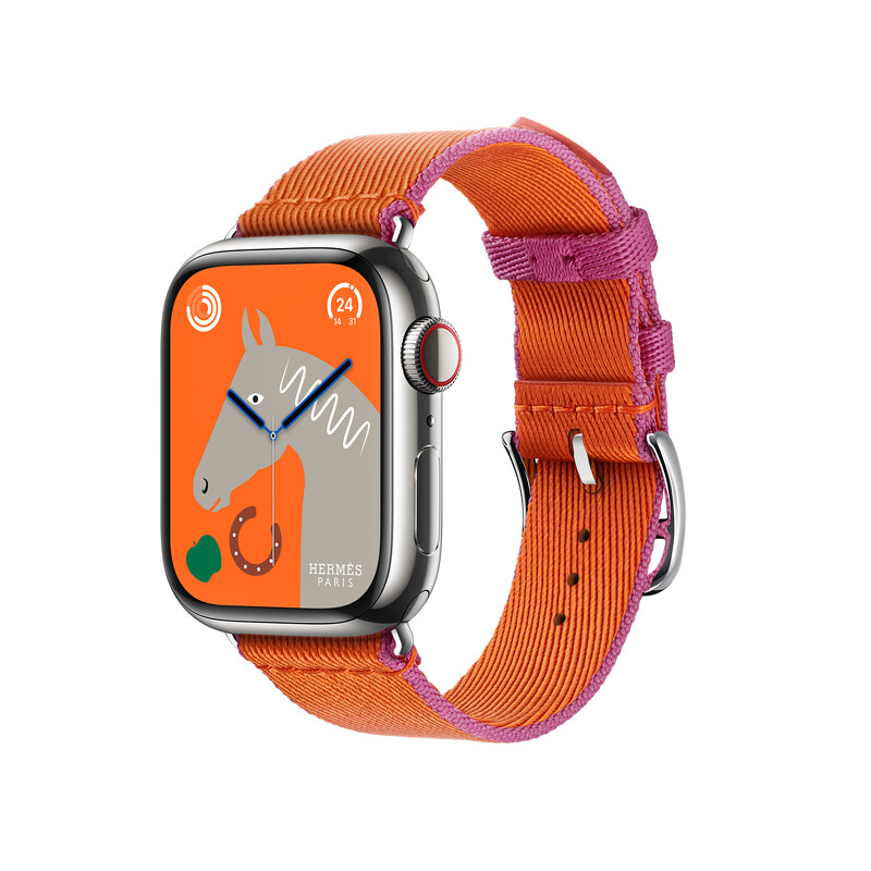 APPLE WATCH HERMES 9系列_41 mm銀色不銹鋼錶殼_橘色搭配墨西哥粉色_尼龍編織 Twill Jump 單圈錶款_NT$ 40,900