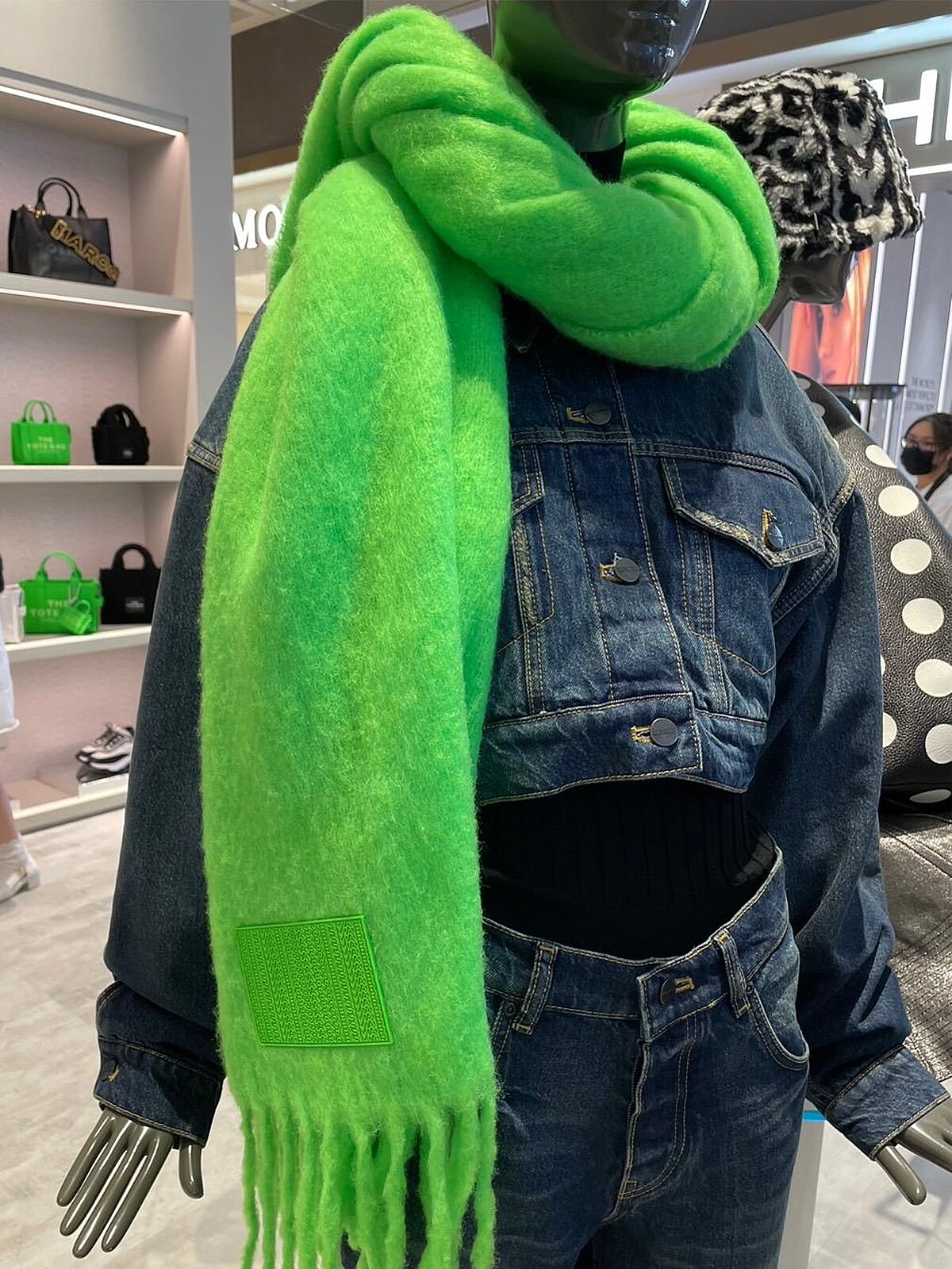 Marc Jacobs 2023秋冬推出一款具份量感的圍巾,使用保暖的羊毛材質製成,注入本季的焦點新色「電光綠」,以及另一款「冰薰紫」,都是能讓你成為人群中焦點的亮點配件。