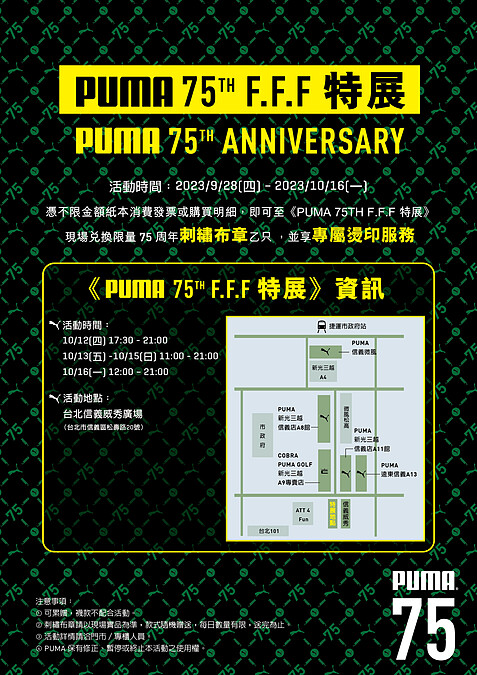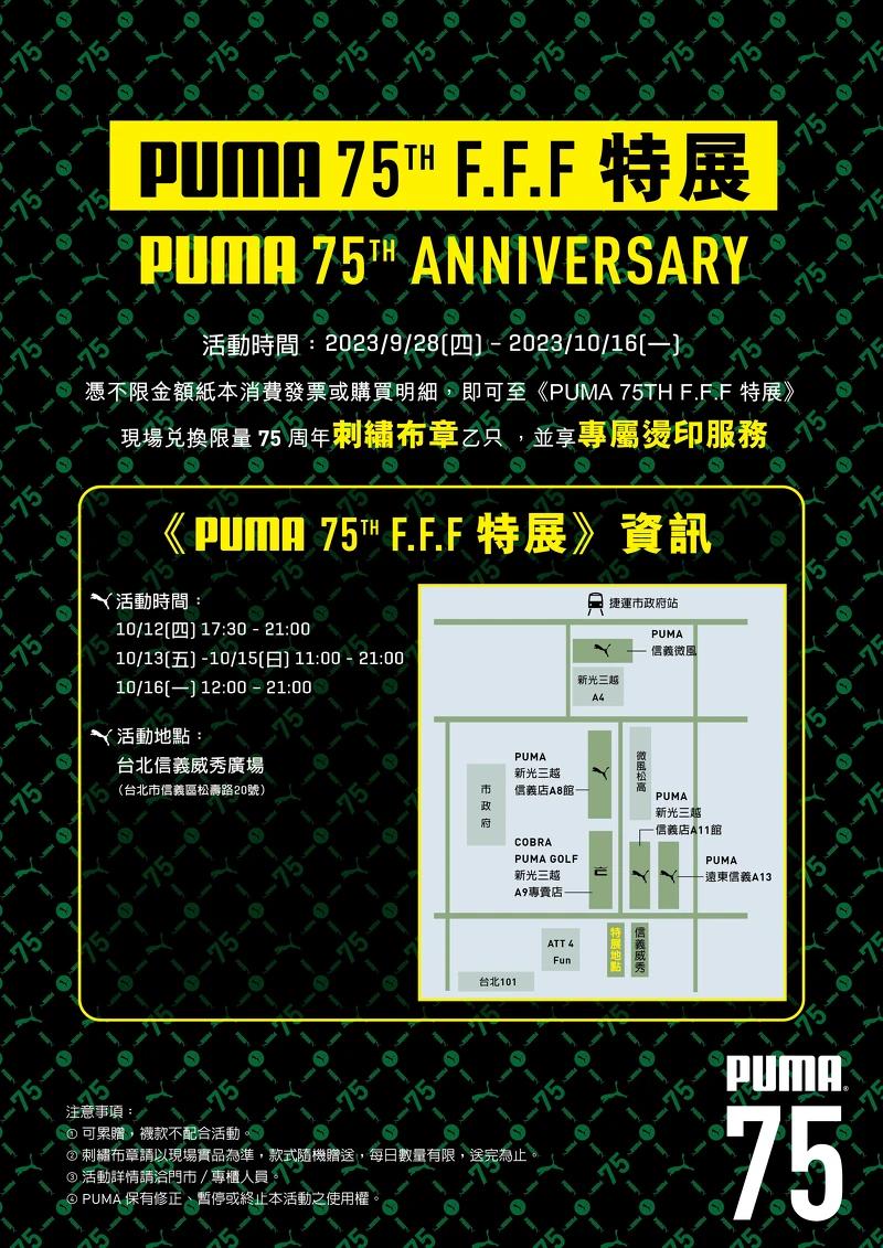 PUMA75週年的生日當然要好好慶祝一番,所以品牌特別挑選10月12日到10月16日間在台北市信義威秀前廣場舉辦《PUMA 75th F.F.F 特展》,將致敬過往去經典、展望未來創新的概念,以及Forever、Faster 和 Fashion 三大品牌價值的歷史底蘊融入活動現場,分別規劃成不敗 PUMA、 PUMA 時代、彪悍 PUMA、PUMA 傳奇及力度 PUMA 五大展區,讓大家可以免費直觀體驗 PUMA 在專業運動、流行時尚、賽車聯名、街頭籃球、足球聯隊及高爾夫等多元領域的文化潮流作品。