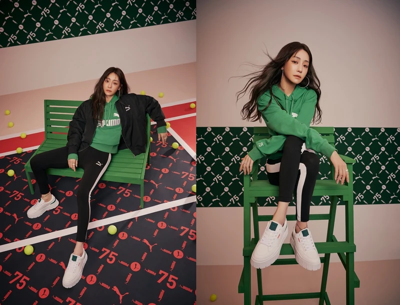 知名演員謝欣穎則身穿網球風格造型搭配PUMA Mayze Stack系列鞋款,厚底小白鞋使用德比鞋結構組成並選用清新純白與鮮綠色注入女孩優雅氣息,質感純綠PUMA烙印皮標與杏色麂皮彎刀鞋身呈現迷人小姊姊風貌 ; 服裝部分則搭配鮮綠 No.1 Logo 厚磅連帽T恤,與黑白色調美洲獅Logo的PUMA經典流行系列T7合身長褲,鮮明大膽多巴胺配色視覺讓秋冬更多了一抹躍動魅力。