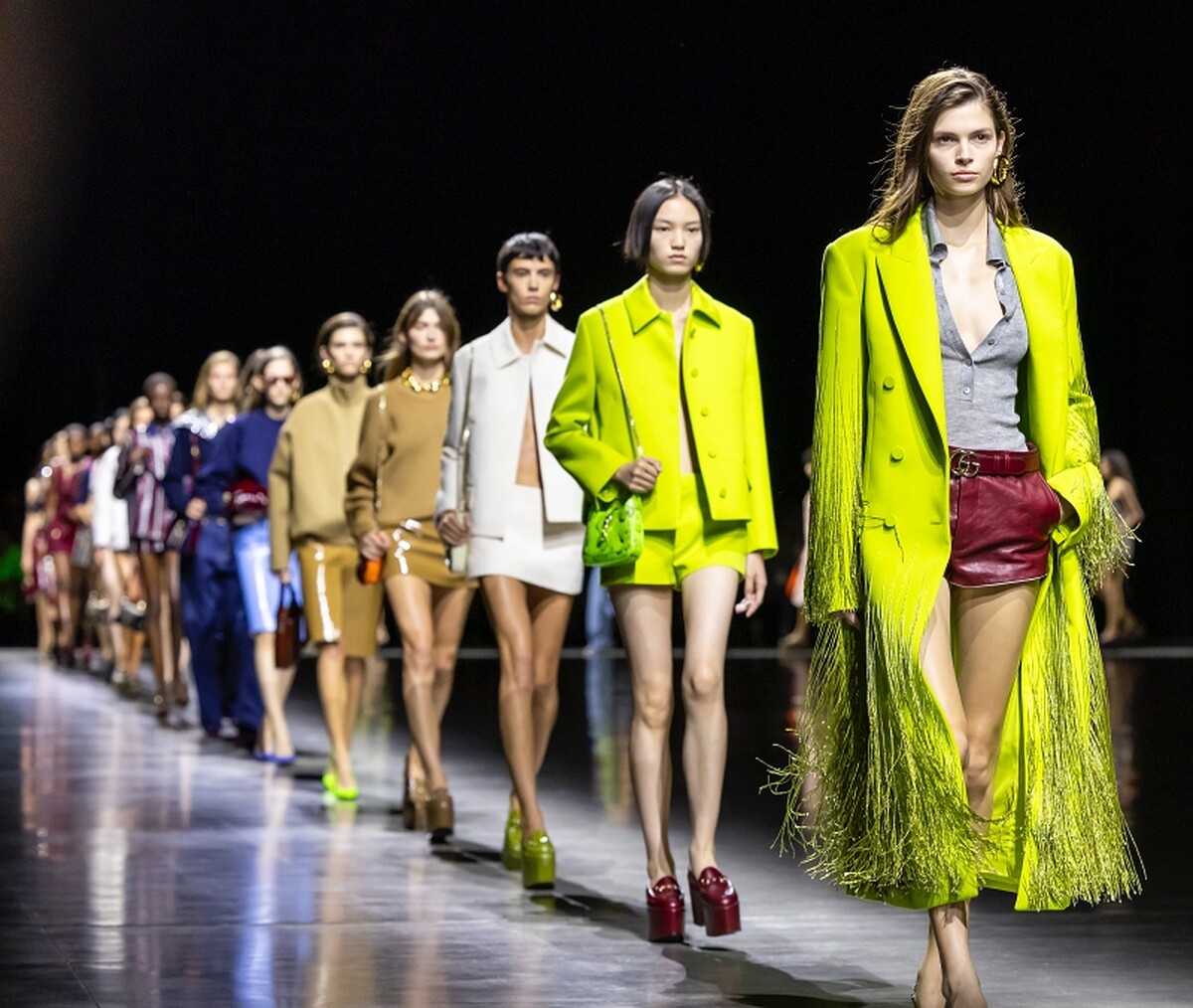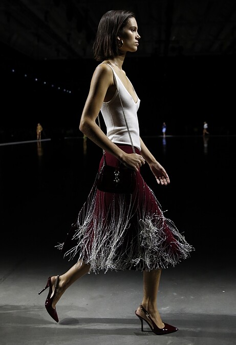 作為大秀上第一個出場的Look,Sabato就開門見山的向大家宣告「極簡時代」的序幕,俐落的西裝領長大衣,內搭白色背心與短褲,其中大量出現的極短褲、裙更是直接道出創意總監Sabato心中對女性的想像;整體少了過去潮奢炫目的繁複高調,搖身一變成了內斂卻不失性感的風格,不禁讓人夢回90年代的Tom Ford時期。