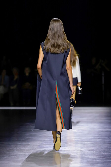 與馬銜扣一樣作為GUCCI品牌標誌性的設計,在Sabato的系列中也出現在許多單品之上,無論是大衣在走動中隱約現身的開衩收邊細節,織帶形象的套裝,或是包身上都可以看到運用這個經典元素的延伸設計。