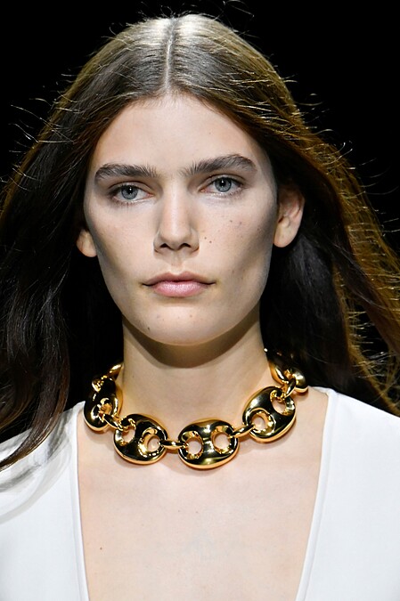 相較起服裝系列上的內斂簡約,Sabato對於飾品顯然是有另一種想像——巨大化,秀上的Model穿搭俐落,但脖上、耳尖與手上都可以看到戴著的份量感強大的金色鎖鍊飾品,這是靈感源自60年代的帆船船錨設計,也是這次春夏系列中的點睛之作。