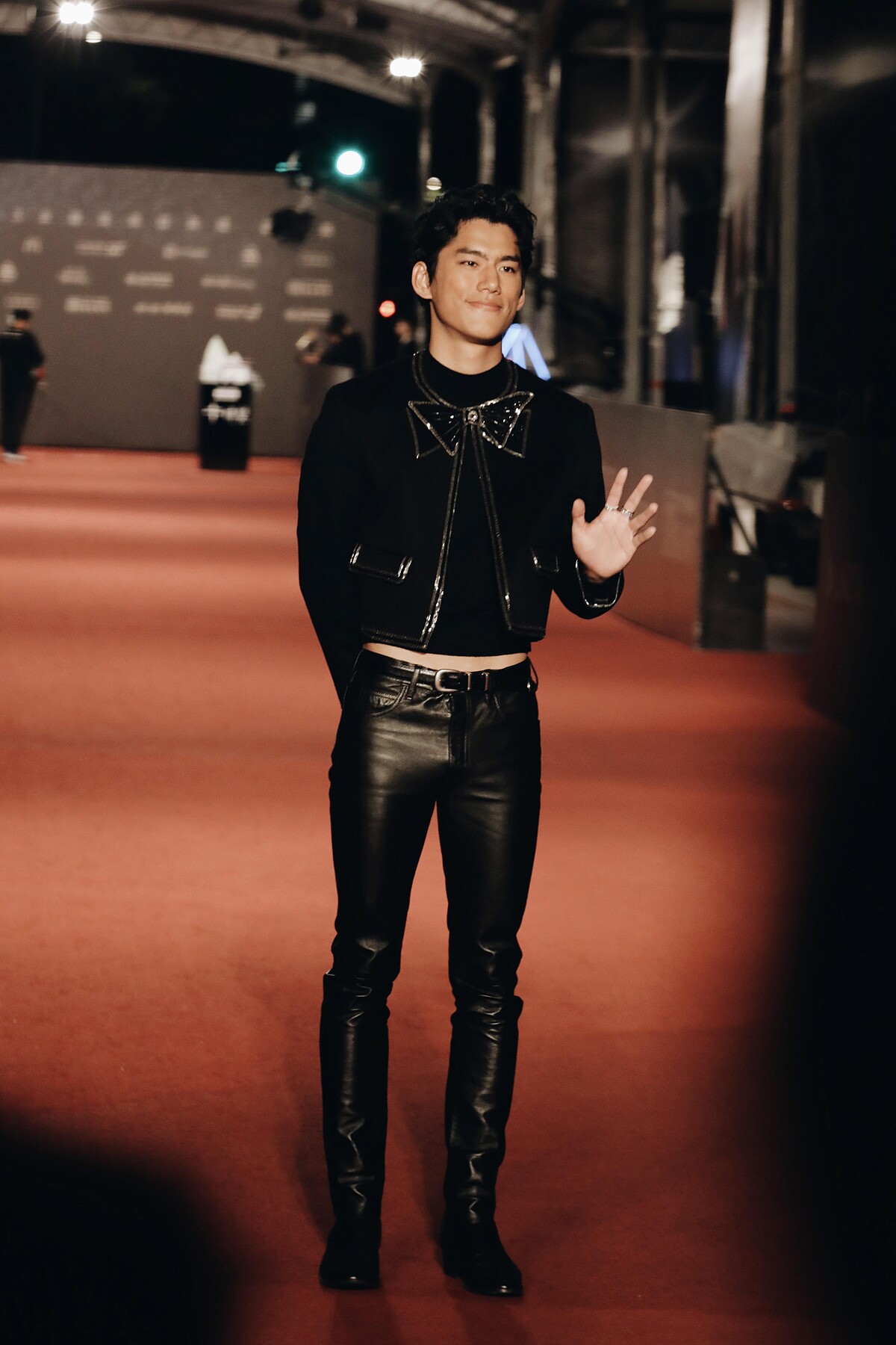 朱軒洋與蔡淑臻一起亮相紅毯,叛逆帥氣的一套造型立刻抓住觀眾眼球,他穿著CELINE HOMME的造型登場,上半身蝴蝶結水鑽外套採短版呈現,下身則以緊身皮褲裝來營造搖滾風格,正好露出了一截腰部肌膚,帶點壞壞的不羈氣息,讓粉絲們都要忍不住尖叫!