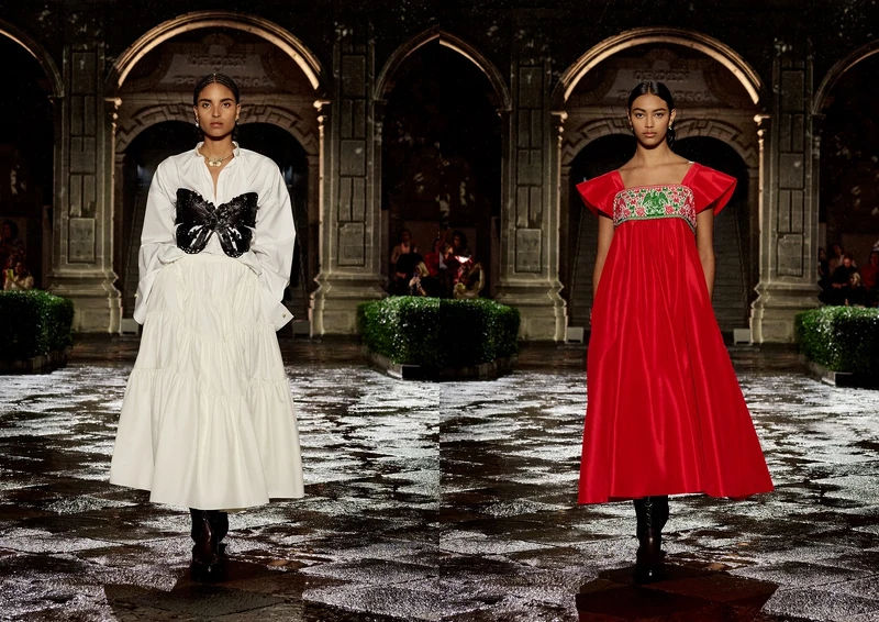 傘狀裙襬搭配束腰的設計靈感正是源自墨西哥傳統服飾Tehuana,而墨西哥格雷羅州的huipil刺繡工藝也被Maria Grazia Chiuri演繹成Dior的模樣。