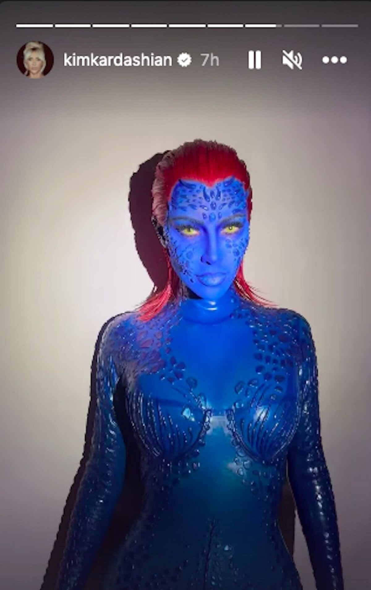 金卡戴珊在2022年則是以超級英雄電影《X戰警》中的魔形女登場,深藍色緊身衣搭配All back的紅髮造型及黃色眼球,連魔形女身上會出現的突起紋路細節都超精緻。