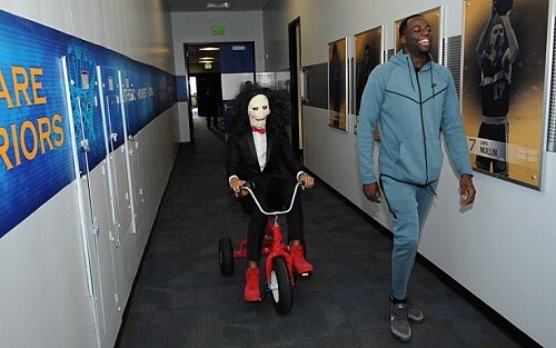 勇士隊的球星史蒂芬柯瑞也非常幽默,過去曾經打扮成吸血鬼、巴斯光年等造型,其中有次打扮成電影《奪魂鋸》中的角色騎著三輪車進場,連旁邊的球員都忍不住笑出來!