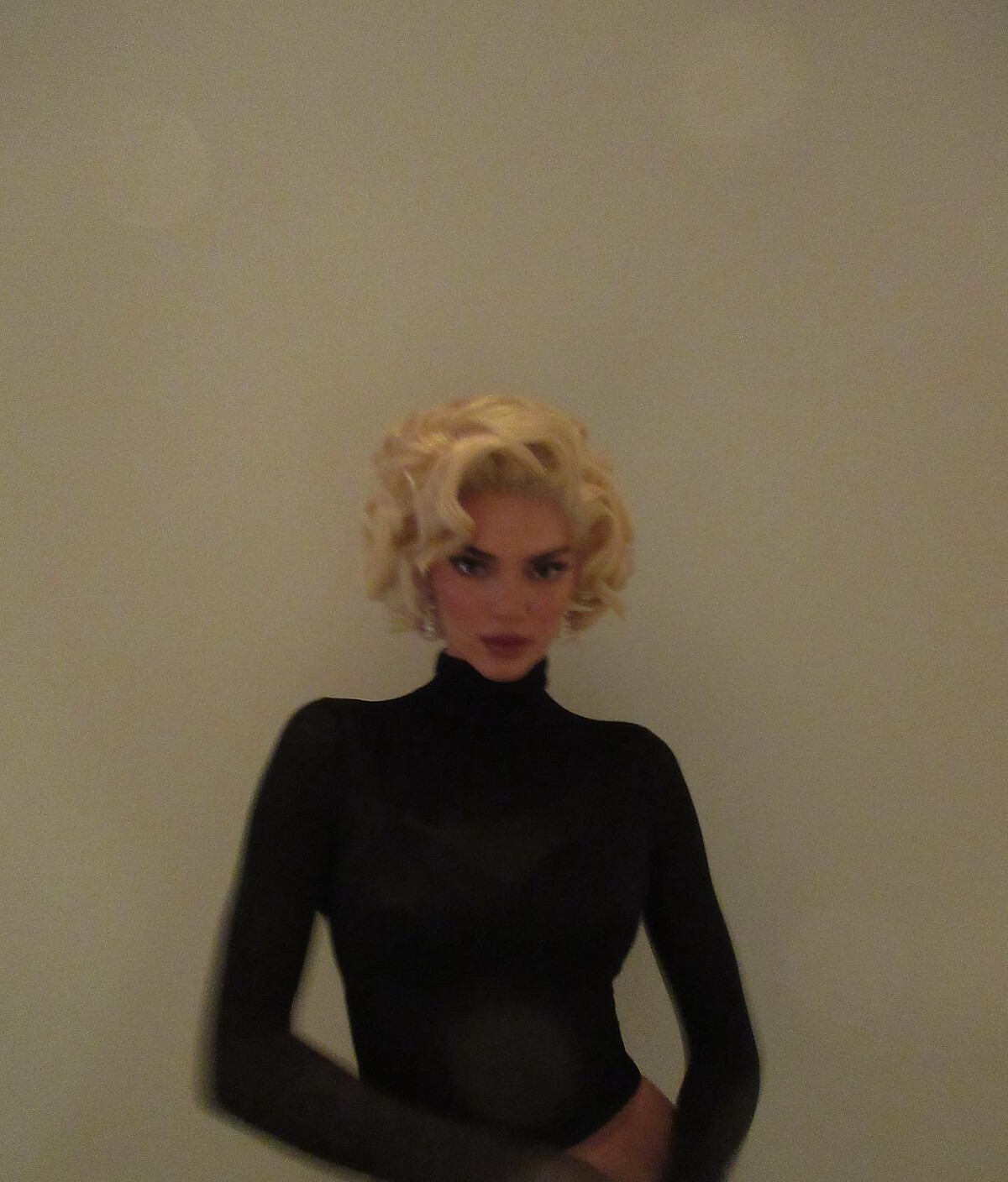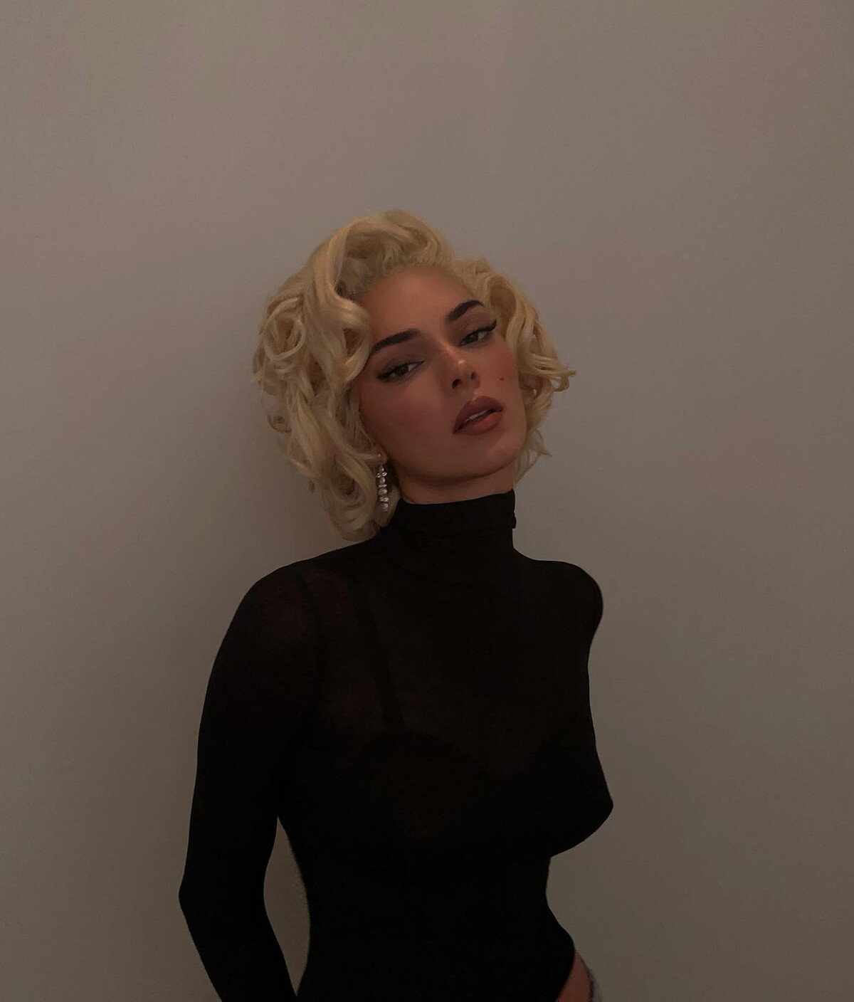 Kendall Jenner在今年萬聖節搶先在個人IG上曝光變裝造型,以黑色長袖上衣搭配金色的大捲短髮化身女神瑪麗蓮夢露。