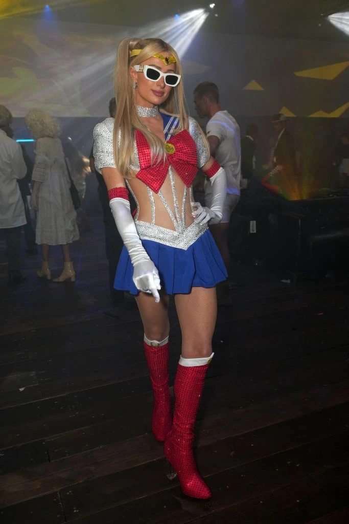 元祖千金芭莉絲希爾頓2022萬聖節化身日本經典漫畫《美少女戰士》中的「月光仙子」登場,一頭金髮雙馬尾搭配鏤空水手服,連燕尾服蒙面俠自己帶上!