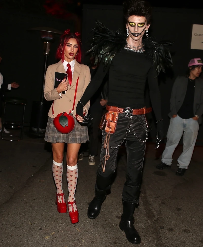 兩人的第二組造型則是選擇了經典日本動漫作品《死亡筆記本》,Machine Gun Kelly高瘦的身高以死神路克造型登場,而今年熱愛學院風造型的梅根則是穿上女高校生制服搭配死神路克最愛的蘋果造型包款!