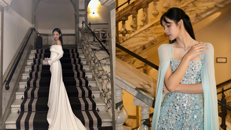Rosé穿著Pinkong桃心領露肩禮服、Saint Laurent的典雅方包,搭配Jimmy Choo尖頭高跟鞋,完成黑色系的優雅造型。Jisoo以Dior的澎袖禮服現身,最有公主的甜美氣質,手上則拎著Dior的CD標誌小圓包。Jennie選擇Lihi Hod的平肩純白婚紗,踩著Chanel的防水台後底跟鞋,手中的蝴蝶結水鑽手拿包很有她的風格。唯一跳脫黑白色系的Lisa,以Georges Hobeika的水藍色披肩禮服出場,被粉絲們讚是《冰雪奇緣》裡的艾莎公主。
