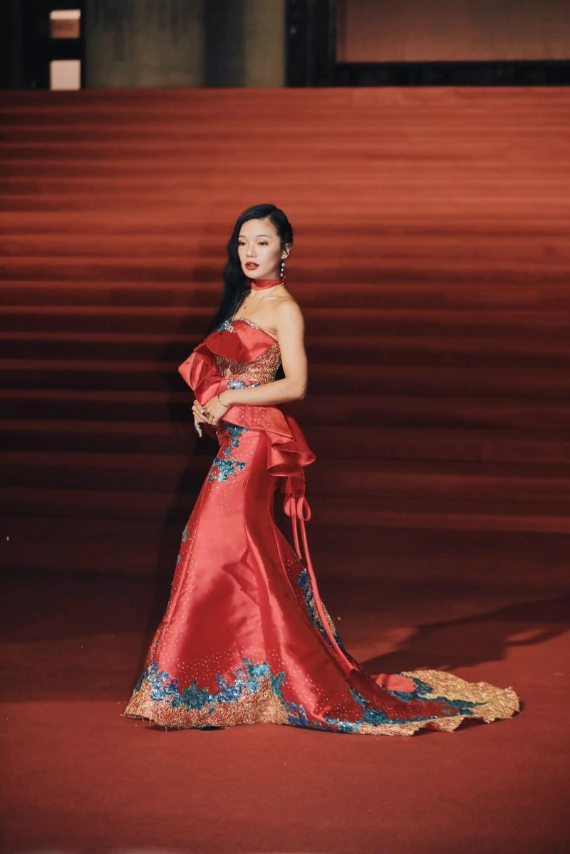 LinLi Boutique 林莉婚紗特別為楊千霈手工訂製一襲星空漸層藍水鑽晚禮服,讓她穿著踏上星光大道紅毯,上頭運用歐洲進口的藍漸層星鑽噴蔥面料,打造銀河般的閃亮層次,裸背設計一轉身讓人眼睛一亮!