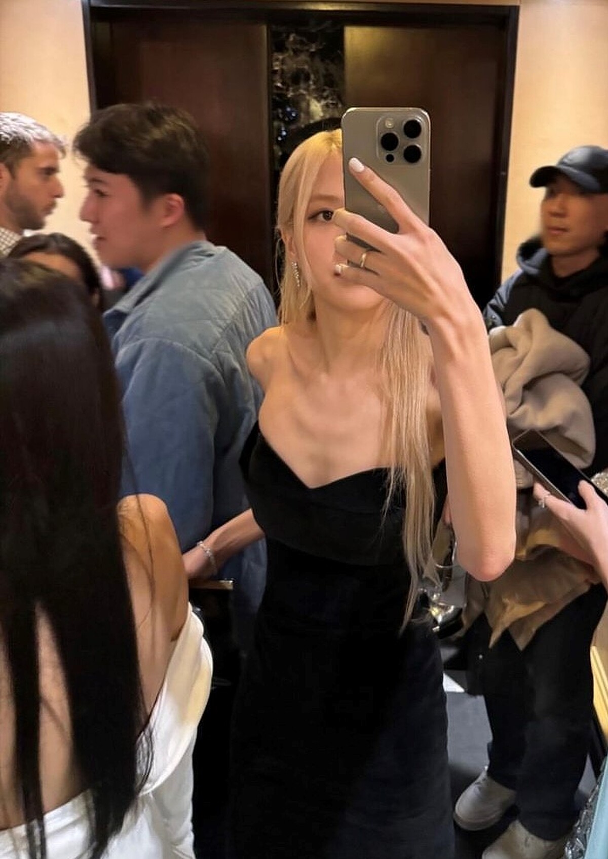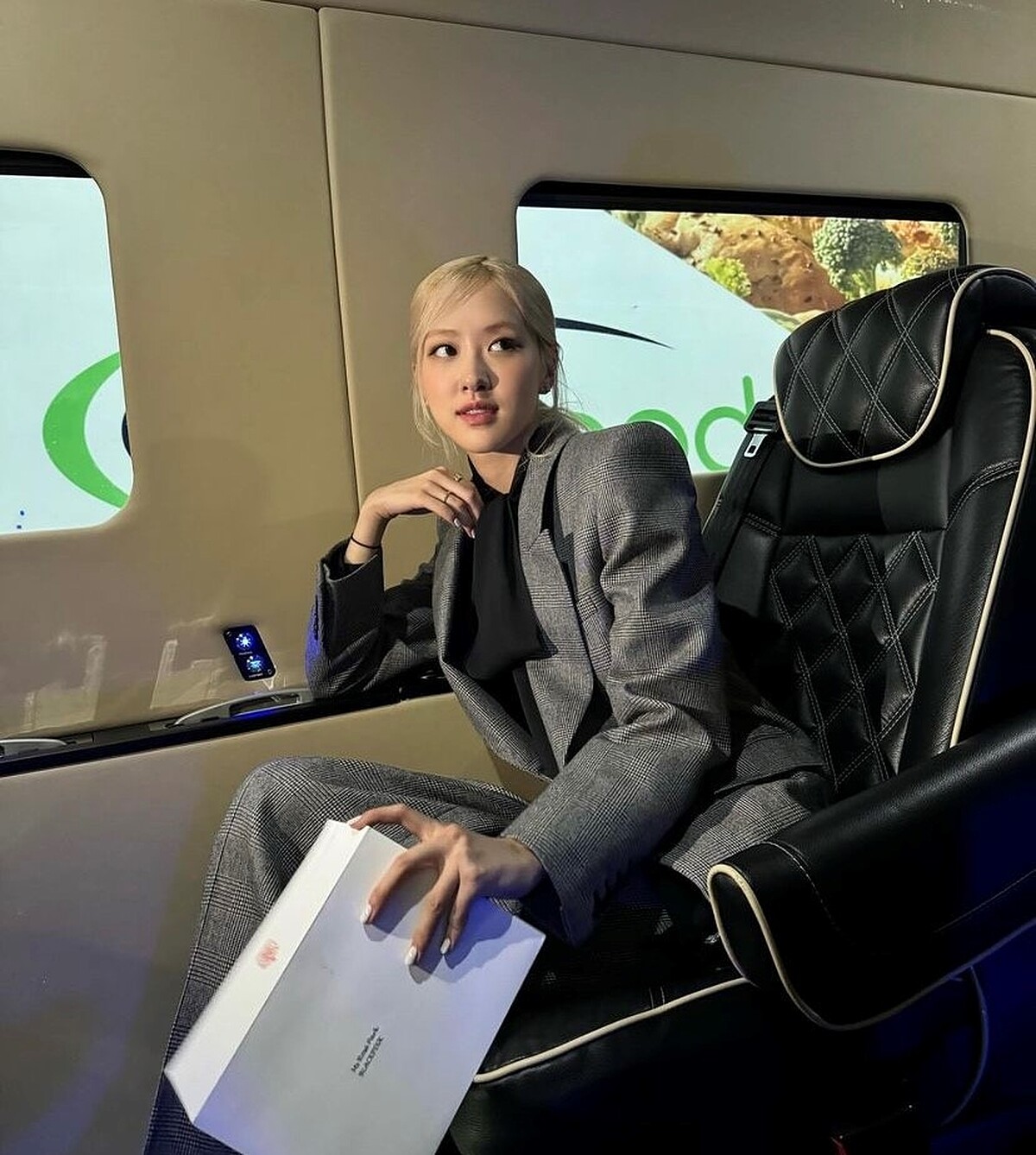 Rosé的風格選擇相較其他三位成員則更顯率性,黑色系桃心領露肩禮服與灰色細格墊肩西裝,搭配造型俐落簡約的珠寶。