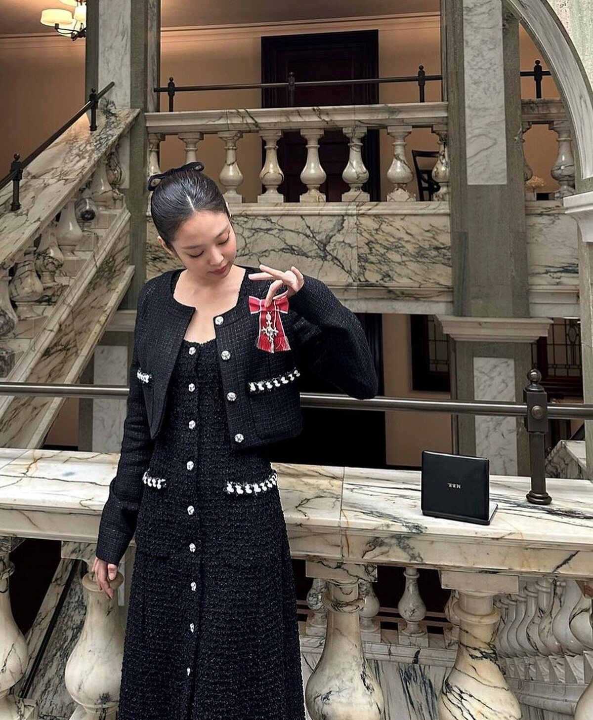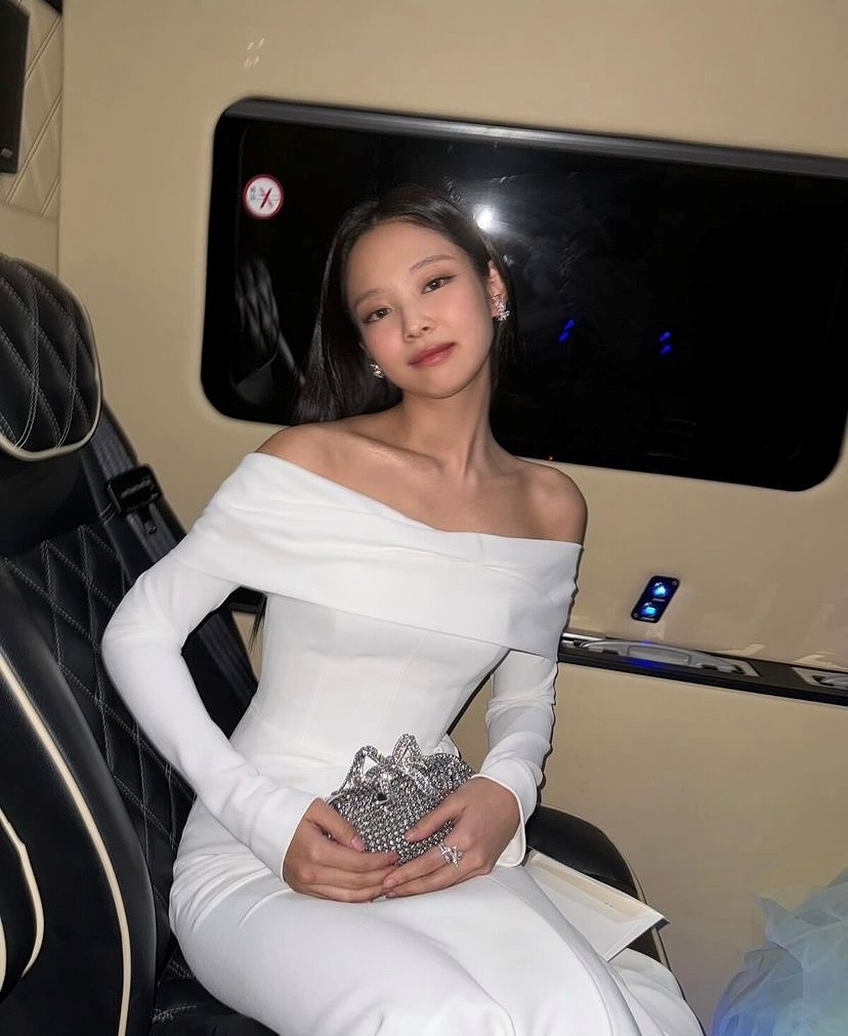 Jennie第一套造型選擇平肩純白長禮服,點綴上鑽石戒指與耳環,第二套黑色毛呢套裝來自Chanel。