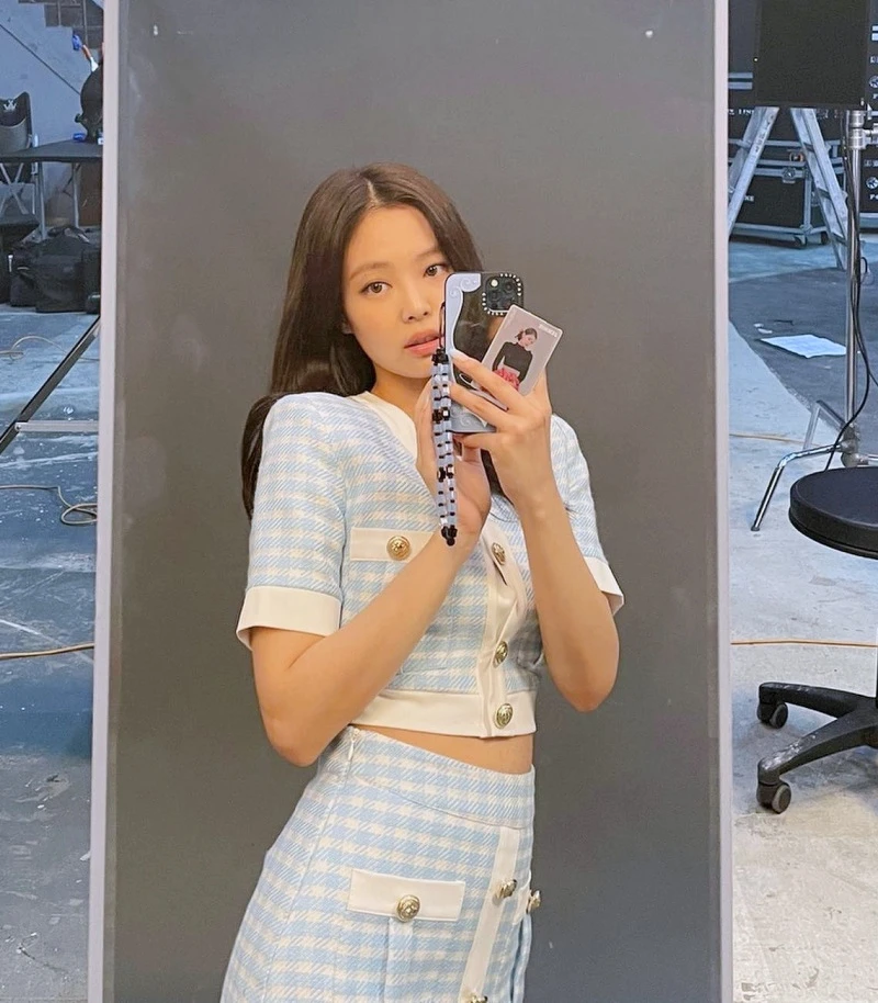 如果不太習慣這種成套式的穿搭,可以學學Jennie在休閒的牛仔褲或T恤穿搭中,搭配上短版格紋、鑲邊毛呢外套的單品元素,這樣的搭配法會是很好的千金風入門!