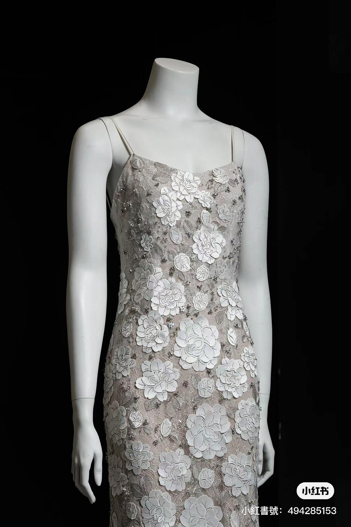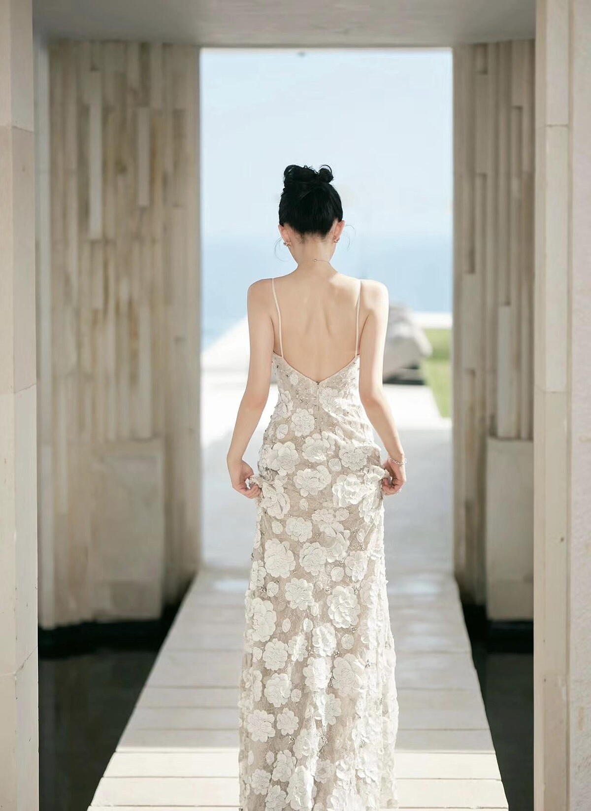 宣云的第二套禮服同樣來自Vera Wang Haute高訂MTO(Made to Order)系列的Perla禮服,收起巨大的澎紗裙襬,第二套造型的禮服服貼身形垂墜而下,優雅的拖曳於身後,面料上使用多層打造透視感受,上頭布滿鐳射雕花,珠繡和金屬織錦佐以真絲歐根紗與蕾絲,遠看淡雅、近看則極致奢華,襯托出宣云凹凸有致的好身材。