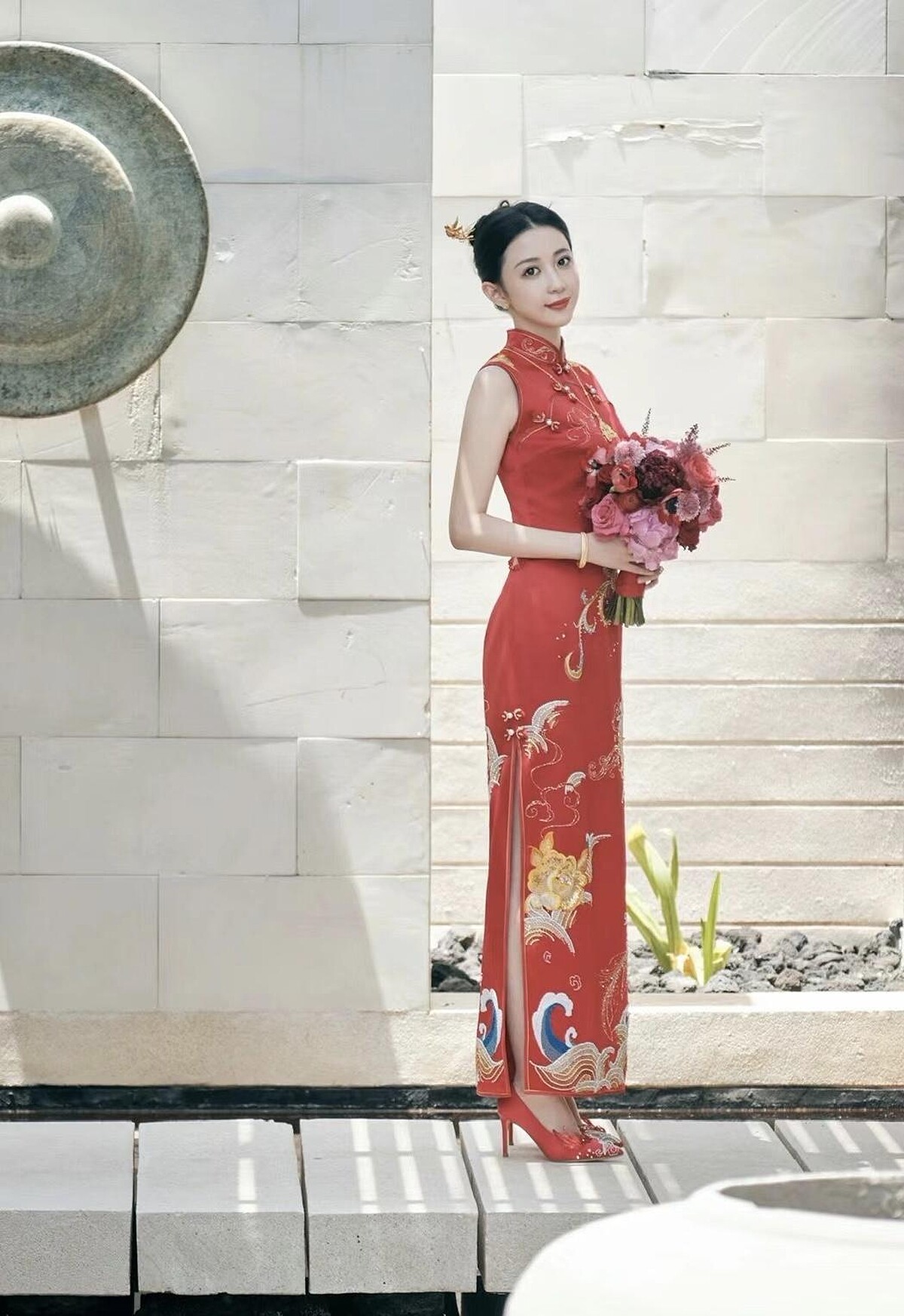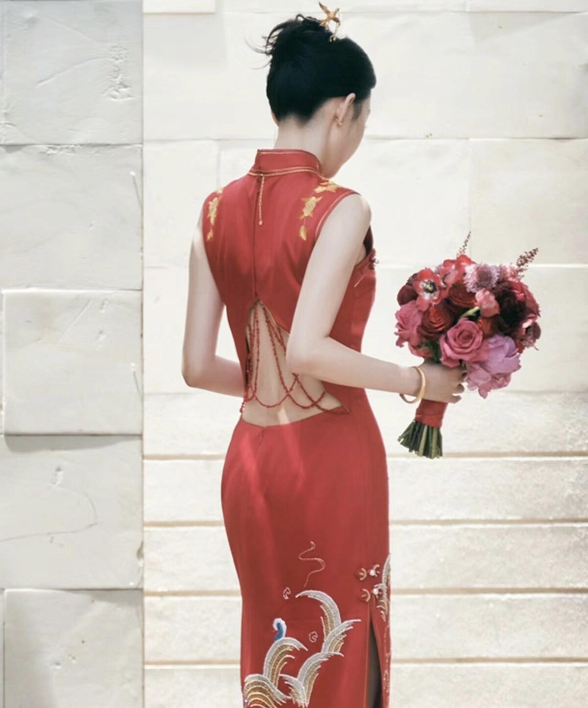 宣云其中一套禮服選擇了中式,由設計師品牌Nora Reve為她特別訂製,朱紅色為底襯得皮膚白裡透紅,透過Luna名字作為靈感,設計師在裙身繡上一隻鳳凰展翅,與月亮圖案刺繡交織呈現,寓意吉祥美好,轉過身鏤空的腰際有珠線妝點,性感而不失隆重,整體融合了古典與現代。