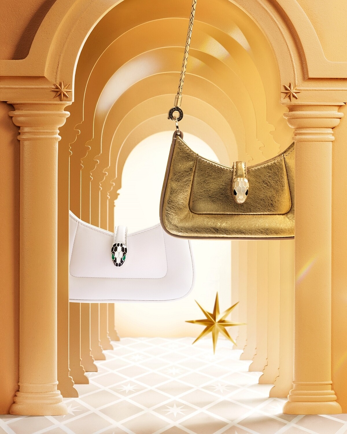 寶格麗的假日系列找來品牌謬思女神安海瑟薇降臨拍攝形象,也是首位拍攝寶格麗冬季佳節形象廣告的全球代言人,與安海瑟薇一同出境的則是寶格麗品牌經典的Serpenti系列包款,金色與白色系的包款色選,非常應景。
