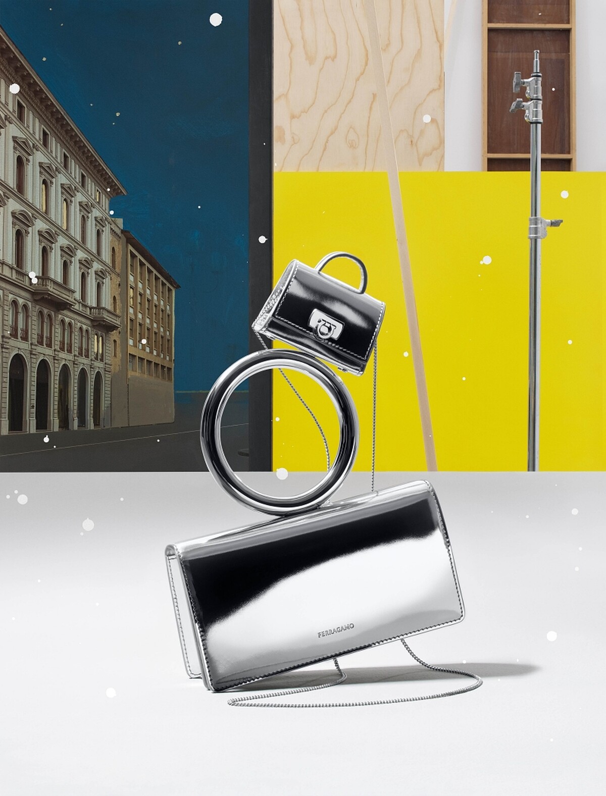 Ferragamo以金屬色迎接年末節慶,包款包闊金、銀色系迷你及超迷你Wanda鍊包,而秋冬主打包款Shoulder Archive及New Frame半月包也換上銀色小牛皮設計,絕對是最繽紛亮眼的派對包款。