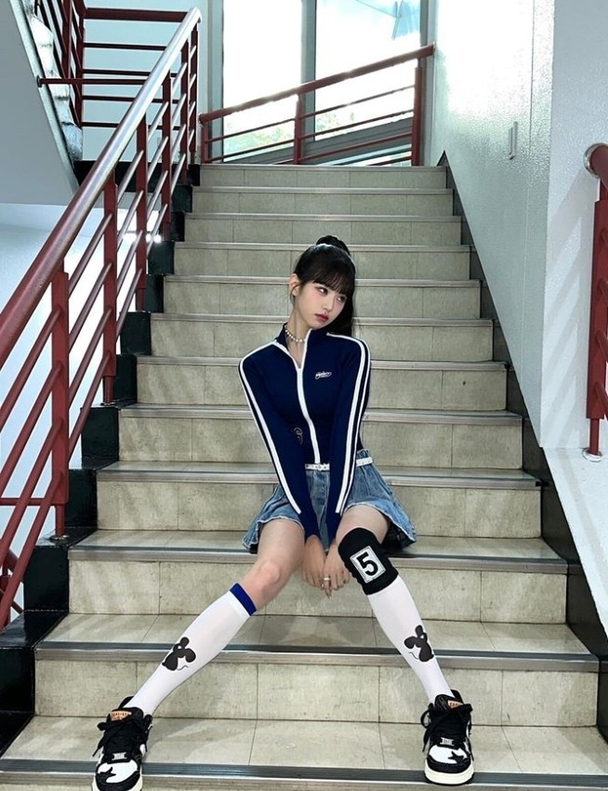 被稱作人間洋娃娃的張員瑛就更能消化「 Blokette 」了,例如運動風開襟外套,搭配上牛仔百褶裙、珍珠項鍊、長襪、球鞋,但同時又用高馬尾來中和,甜而不膩還帶有一絲帥氣;另一套亮點則在腿上的蝴蝶結蕾絲襪,配上紅色棒球外套、學院裙,相當出彩。