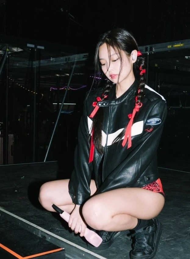 Jennie 在多場演唱會中,就完美演繹了「 Blokette 」的風格,全套芭蕾舞裙,配上動感十足的賽車外套,最後配上紅色蝴蝶結呼應色彩,將甜美與酷帥融為一體;另一套則用偏運動風的短裙,配上芭蕾風的堆堆襪,耳後蝴蝶結點亮風格。