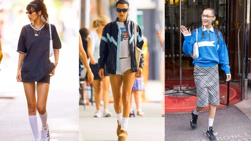 作為時尚界Icon,Bella Hadid 的穿搭中,也早就透露不少「 Blokette 」風格的搭配,雖不像是 Jennie 充滿蝴蝶結,但卻將運動風的球衣、外套,完美融入各種搭配,例如透氣球衫與長襪的碰撞,又或是加上甜美菱格長裙、All back 辮子頭,人群中特別出眾。