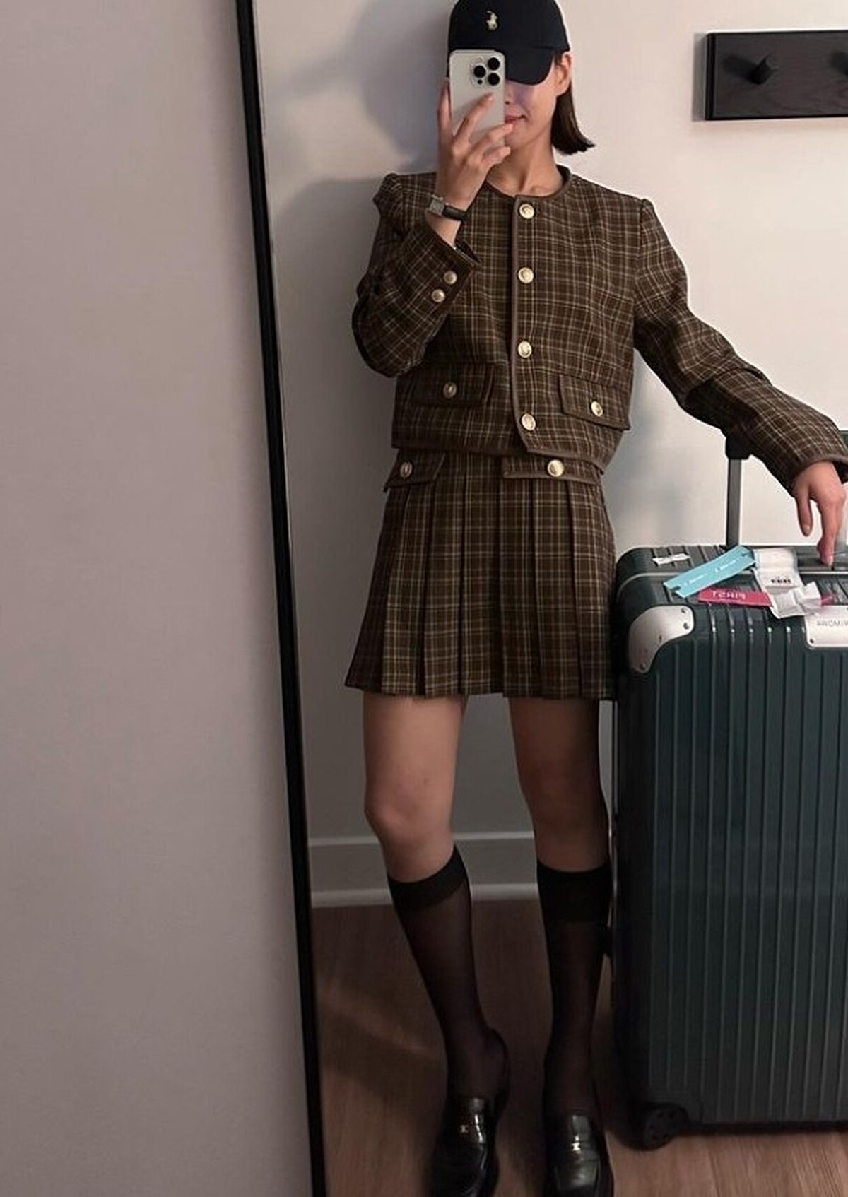 另外韓系穿搭當中,怎麼能夠少了小香風呢?高旻示的日常穿搭當中就可以常常見到,它利用藍色粗針織款式的小香風外套,或者是偏英倫風的卡其套裝,又或者是乾淨的黑、白襯衫搭配裙裝,以及純白的西外連身裙搭配,都盡顯高雅氛圍。