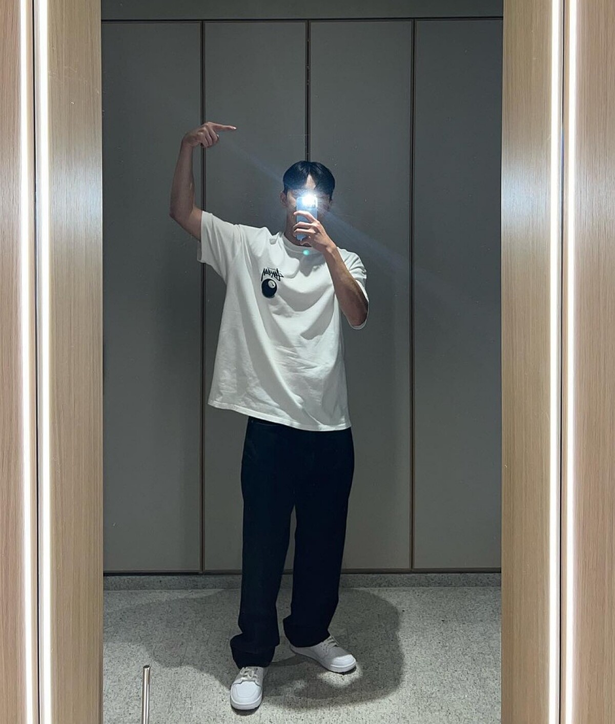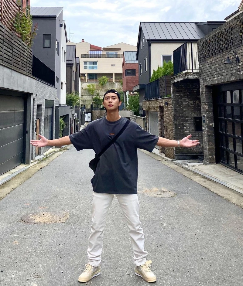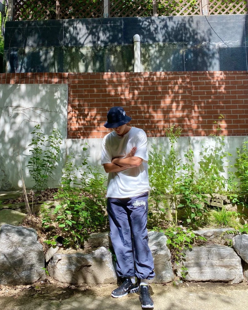 短袖T恤+長褲可以說是他的最愛穿搭之一,不愛疊搭太多層次的朴敘俊最喜歡將各種寬鬆的短袖T恤搭配上運動褲、牛仔褲、棉褲等單品就完成了造型,然後再用一雙帥帥的球鞋做亮點。