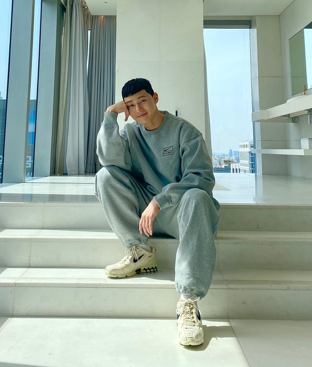 說到不用花心思想穿搭的造型,套裝絕對有一席之地,朴敘俊最為人所熟悉的這套灰色棉質運動套裝,雖然很有可能一不小心就變成體育老師的風險,卻是非常直覺式的搭配。