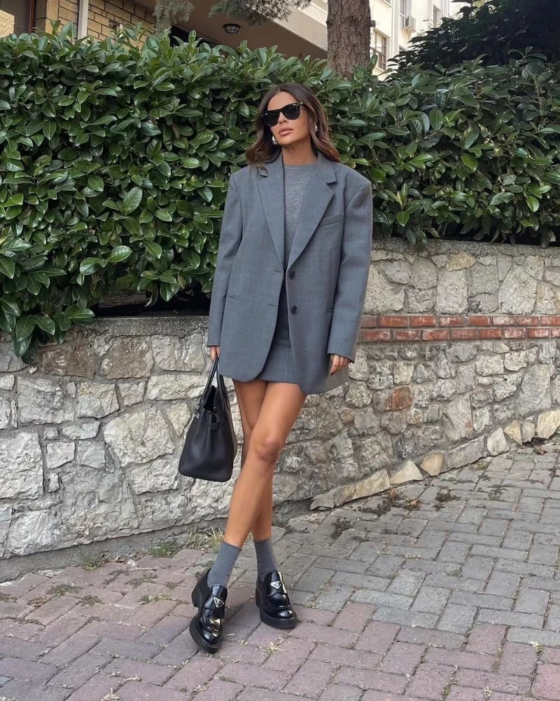4、灰色西裝外套+短裙