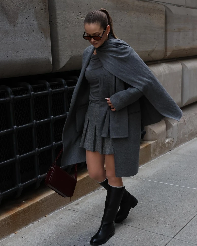 3、灰色大衣+灰色毛衣+灰色短裙