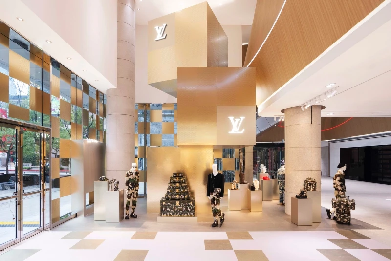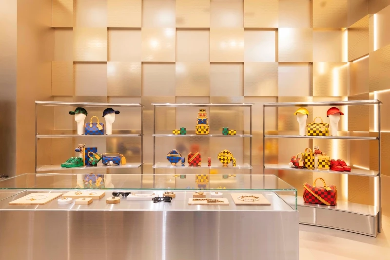 LV男裝快閃店門口有著以Louis Vuitton字首設計的「LVERS」巨型發光字樣,整體電裝靈感以品牌於1888年首個標誌性Logo「Damier棋盤格」設計,搭配上鍍金棋盤格作為快閃店外牆主視覺,金光閃閃的奢華感呼應本季主題-太陽The Sun,店內主要以2024春夏系列服飾、包款、配件、鞋履等分為兩區展示陳列。