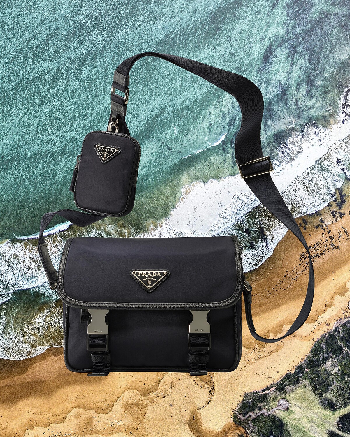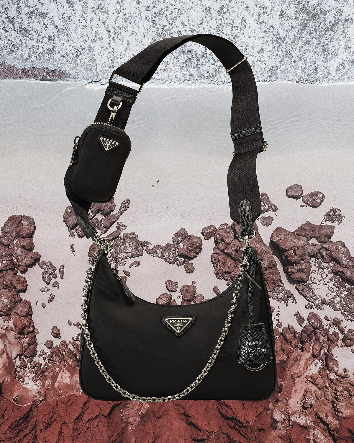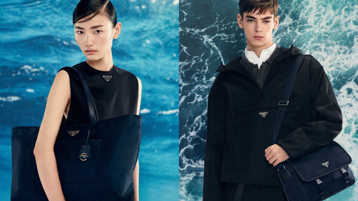 Prada Re-Nylon 系列將從海洋(如漁網)和垃圾掩埋場所收集的塑膠,以及來自世界各地的紡織纖維廢料,透過回收與淨化製成再生尼龍。經過複雜的降解與再聚合過程,此系列的紗線皆以循環的方式生產——如此繁複艱辛的一段旅程也成為 2024 年 Prada Re-Nylon 系列形象廣告的靈感,以其積極保護的環境海洋做為背景框架,由 Emma Watson (艾瑪華森) 與 Benedict Cumberbatch (班奈狄克·康柏拜區)共同演繹,展示一系列永恆經典的設計。
