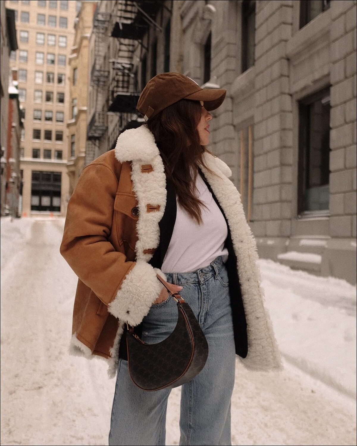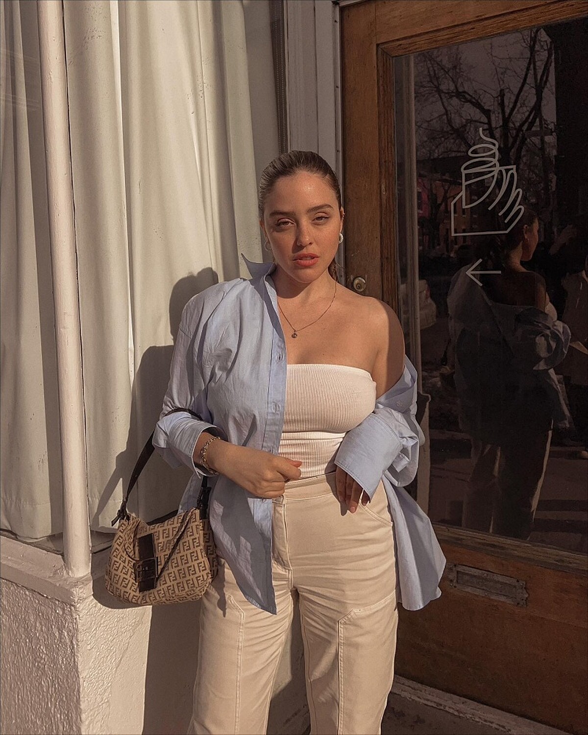 對於下身的選擇,Sarah Babineau經常會選擇的是高腰、直筒的寬褲為主,上半身是貼身、短版的單品,這樣的穿搭方式不僅可以有效的修飾腰間的小肉肉,也能適當地露出比例較瘦的上腹肌膚,在全身的比例上也有拉長的效果喔。