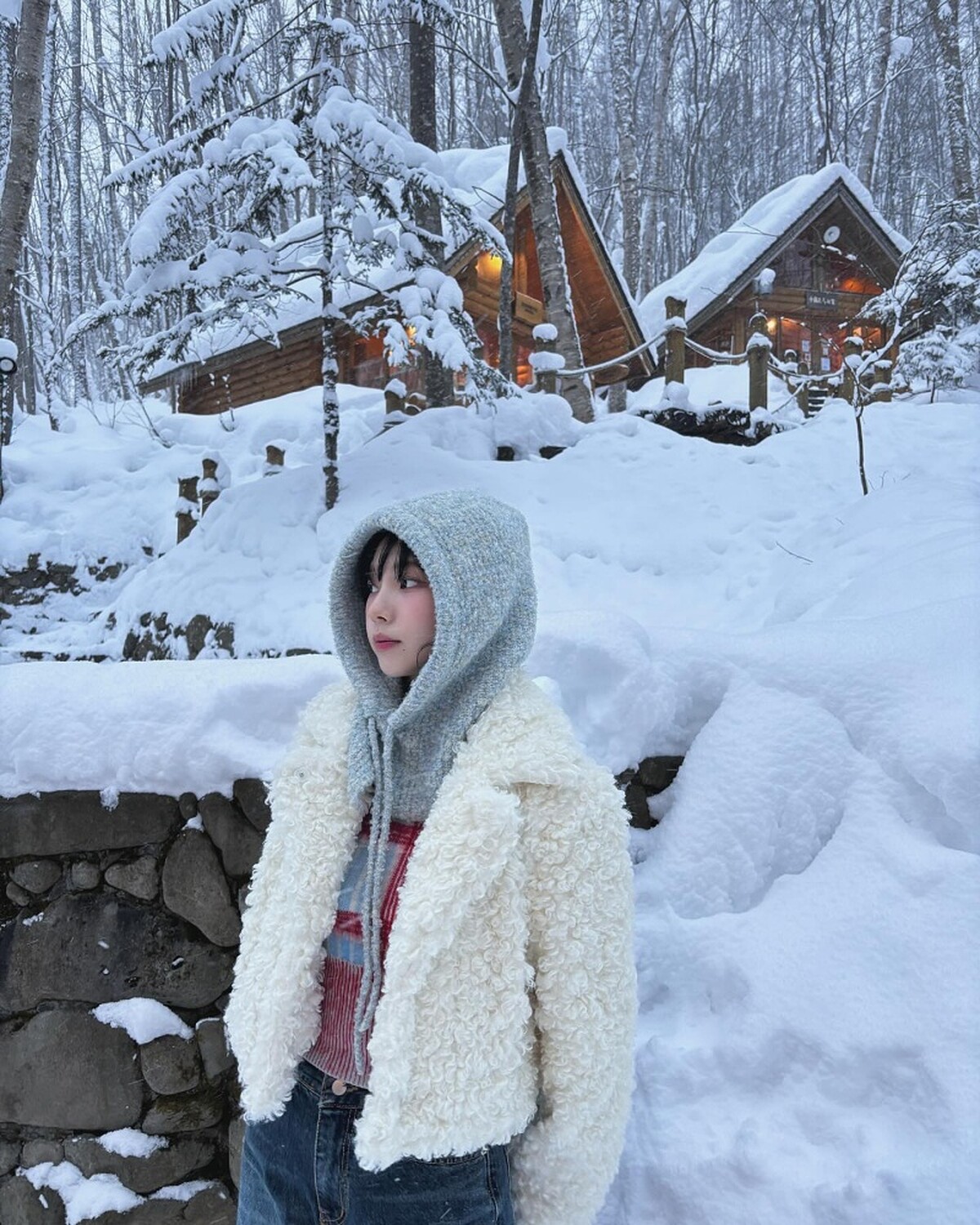 寬鬆毛衣、砰砰夾克、連帽上衣,Karina在冬日的出遊照中穿搭了一些頗具休閒感的單品,不過在搭配上以蛋糕長裙、泰迪熊外套作為亮點,整個人比起舞台上多了鄰家女孩的親切感,也不會過於休閒。