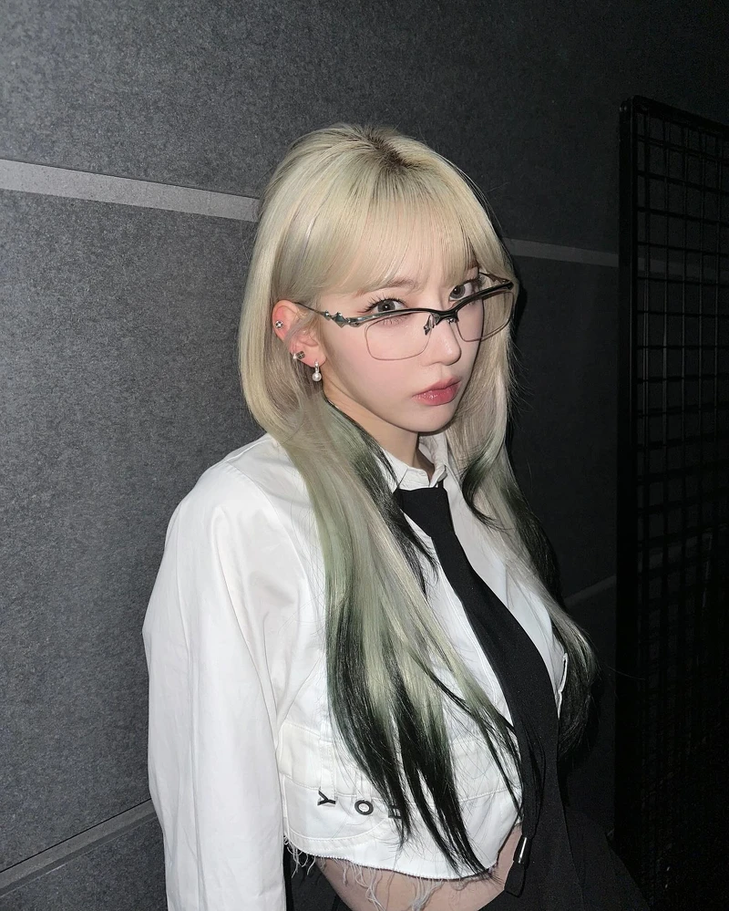 韓國女團Le sserafim的日籍成員宮脇咲良,則是在IG曬出白色短板襯衫配上黑色領帶+百褶裙的學院風穿搭,搭配鏡腳星型造型的下無框眼鏡,整體看起來是帶點叛逆感的學霸氣質,也是全無框眼鏡之外的另一種選擇。