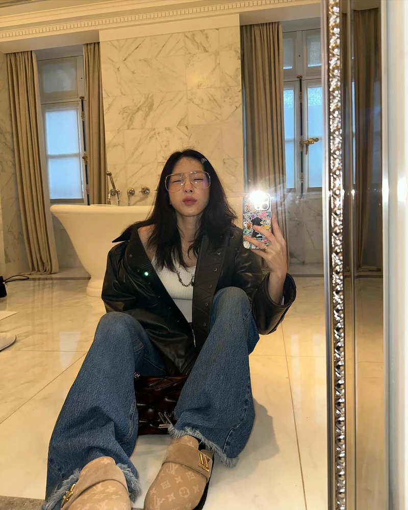 太妍在去年出席春夏巴黎時裝週Louis Vuitton的大秀時,早早就以黑色皮夾克,與緊身的短背心、牛仔褲的造型搭配金屬框眼鏡,在率性街頭的風格中又加入了反差的書卷氣,展現多元的搭配度。