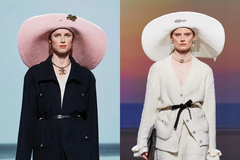 在香奈兒女士最初開設帽子店的所在地杜維埃,有著海洋的氣息,作為靈感的木棧道上,寬簷帽是標準配備,本季運用粉嫩亮色系打造帽款,在寬帽簷上運用翻簷的手法詮釋,是頗具當地風情的象徵。