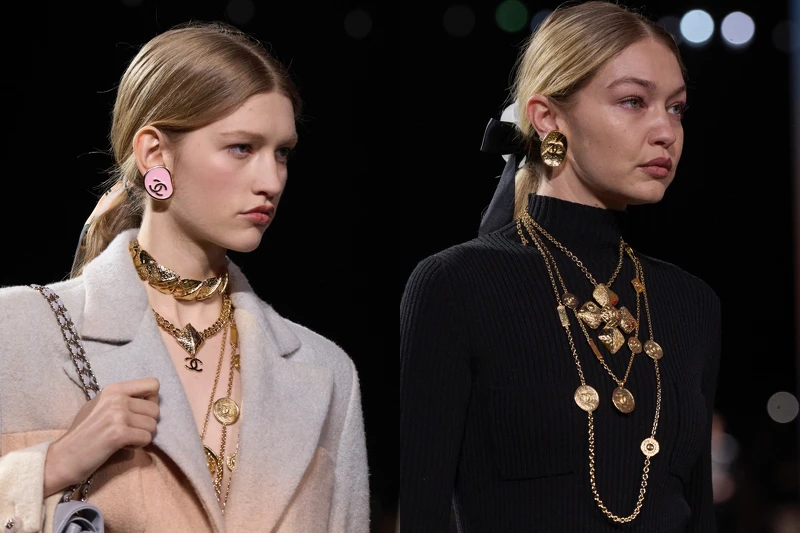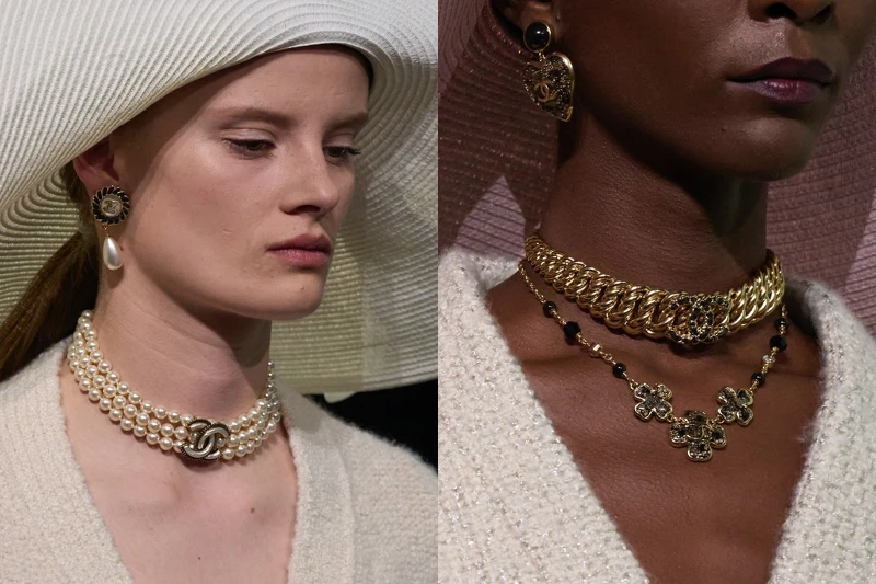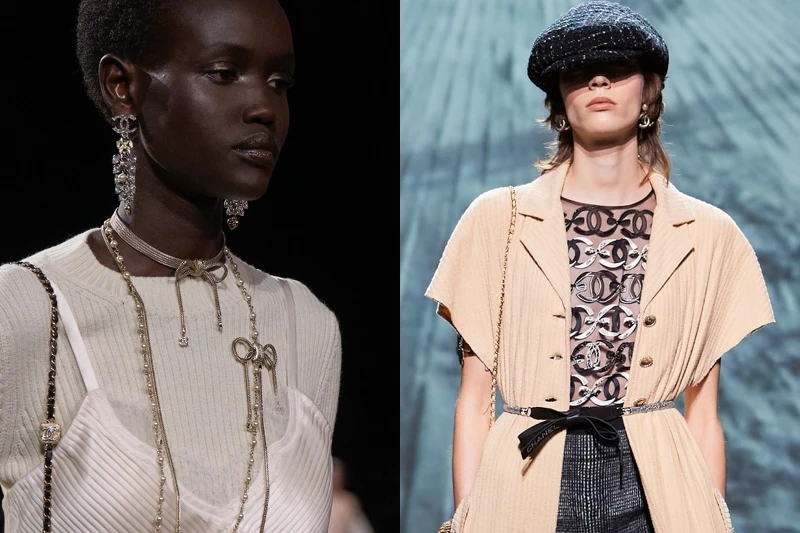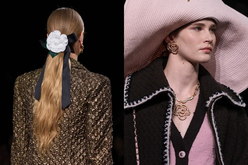 配件上,放大與繁盛的手法不斷出現在項鍊、耳環之上,三層珍珠串鏈、寬版金鍊等都展現了華麗又搶眼的造型,在本季也將蝴蝶結加入了腰帶與項鍊的設計中,而標誌性的山茶花則是成為項鍊與髮飾,在伸展台上傳達香奈兒本色。