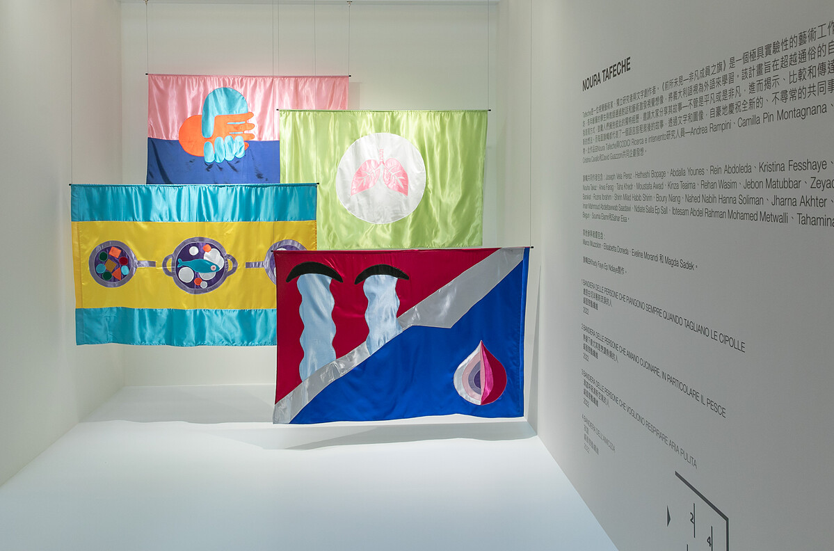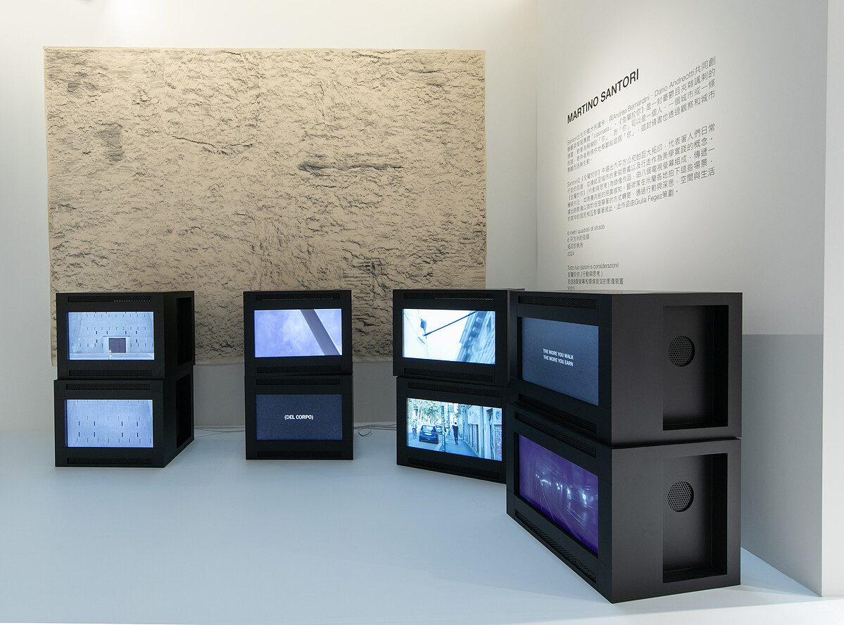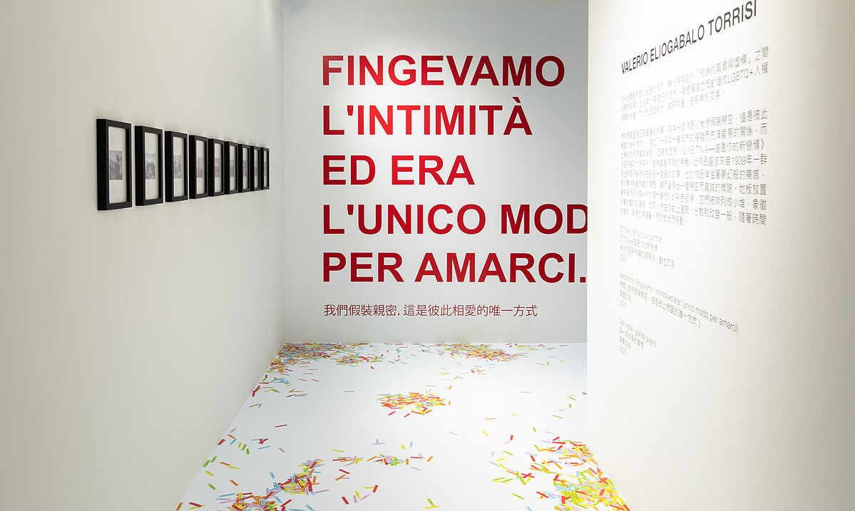 特展展出了4位新銳藝術家Valerio Eliogabalo Torrisi、Martino Santori、Cristiano Rizzo、Noura Tafeche的作品。牆上的語句「我們假裝親密,這是彼此相愛的唯一方式。」便值得深思,展區腳下的彩色紙條上寫著「僅限今晚」,除了以團聚、落單的形象來比擬人們之間的關係,也讓人很有想像空間。箱型電視機裡播放的影像,為藝術家親自於米蘭街道取景,呈現他眼中的城市模樣;一幅幅高掛的旗幟,則訴說著不同的故事。