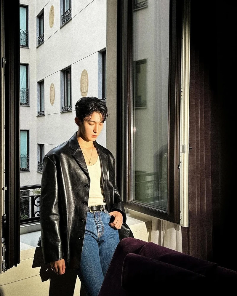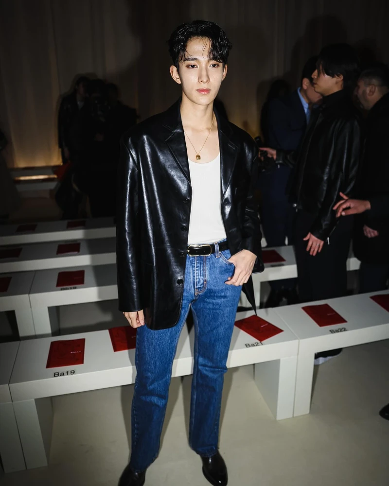 前往米蘭出席Bally大秀的DK,穿上黑色皮質西裝外套,內搭白色上衣與稍合身的牛仔褲,叛逆不羈的造型真的讓人好心動!