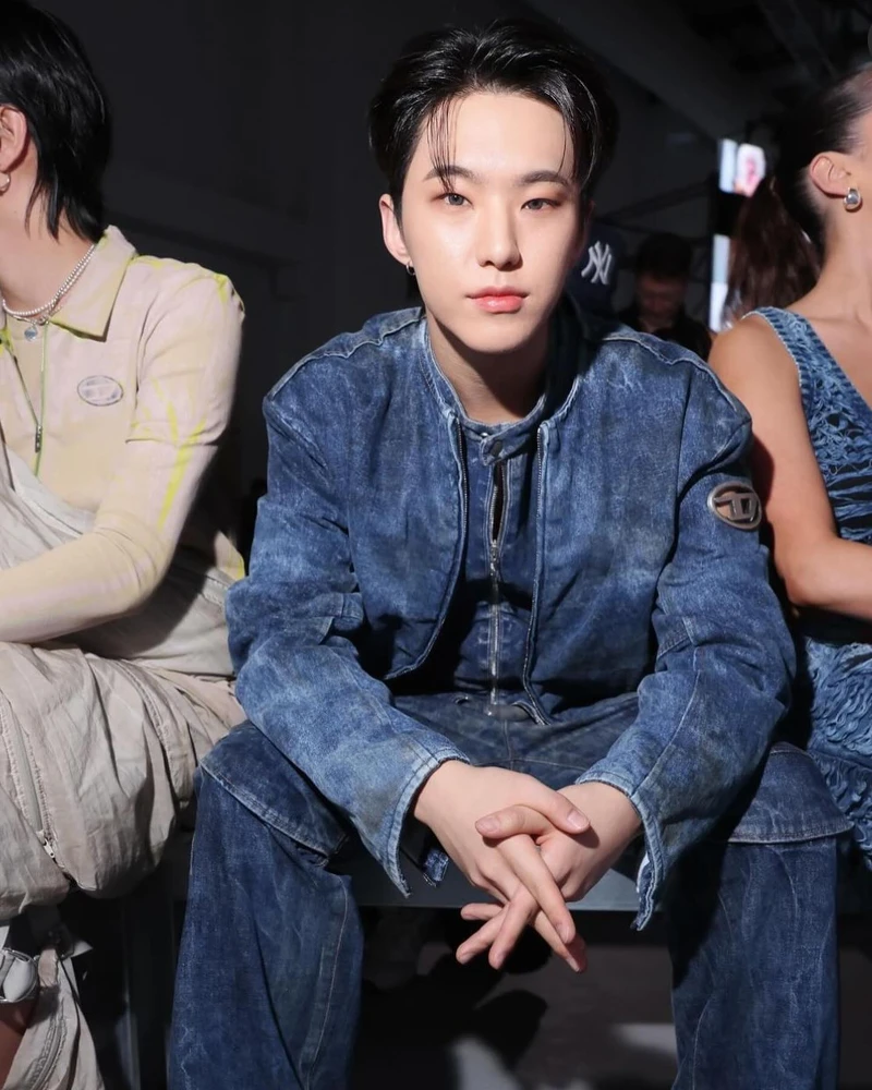 順榮出席了Diesel在米蘭的秋冬時裝大秀,選擇了標誌性的品牌單品牛仔套裝登場,全套帶著水洗設計的丹寧裝束,帶點喇叭的復古版型,也讓整體散發高級街頭時髦感!