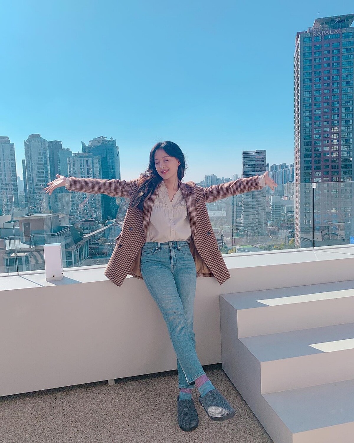 相較與在《淚之女王》劇中正式氣場的西裝外套搭配,私下的金智媛偏好加入休閒感的格紋西裝外套穿搭,下身穿上淺色系的牛仔褲,很適合平時的上班搭配。