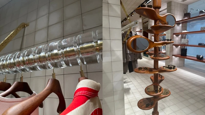 除了店裝呈現威尼斯的風格,在陳列裝置上,服裝掛桿引進威尼斯小島上吹製玻璃的傳統工藝設計,搭配的是傳承下來的鍍金工藝,而包款、眼鏡系列的陳列台則是延伸水滴流動設計的概念,完整呈現義大利的風土民情。